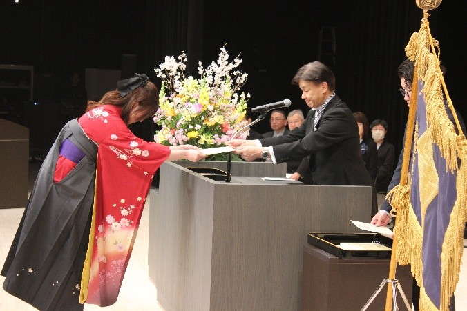 式典では、長野克則校長が卒業生に卒業証書授与、修了生に修了証書授与並びに学位記を伝達し、「本校の卒業生・修了生は、多様な分野で専門家や指導者として活躍しています。皆さんも4月1日からその仲間入りをします。5年間で身につけた専門知識や技術、多様な学びと仲間との経験は、これからの人生を支える大きな財産です。今求められているのは、新しい発想や柔軟な思考、そして社会に貢献しようとする姿勢です。本校で培った専門性と問題解決力を生かし、それぞれの道で時代を切り拓く技術者として活躍されることを期待しています」と告辞を送りました。