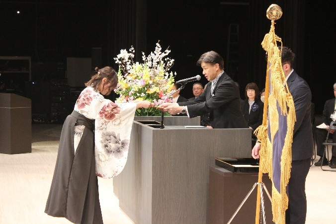 その後、卒業生を代表し、機械系の成田敦哉さんが「私たちは4月から就職や進学など、それぞれの道へ進みます。困難や挫折に直面することもあるでしょうが、苫小牧高専で得た知識と経験を活かし、向上心を持って前へ進んでいきたいと思います」と答辞を述べ、続いて修了生を代表し、創造工学専攻の岡田航季さんが「これから私たちはそれぞれの進路へ進みます。未知の課題に向き合う中でも、科学的思考と探究心を忘れず、社会に貢献する研究・技術の創出に努めてまいります。また、分野を越えた協働を重んじ、新たな価値を生み出す人材として成長し続けることを誓います」と答辞を述べ、校歌斉唱の後、閉式しました。