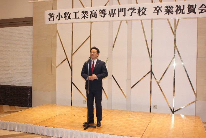 また、ご来賓を代表し、工藤俊文後援会会長が「苫小牧高専の信条である「誠実な心情」、「友愛の精神」、「不屈の気力」をもってこれからの時代を生き抜き、自己実現を図ってください」と祝辞を送りました。